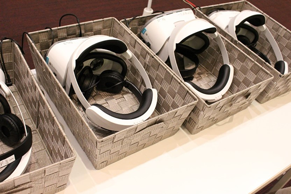 VR(バーチャル・リアリティ:仮想現実)ゴーグルを使って、実際の仕事の現場にいる様子を体験するブース。