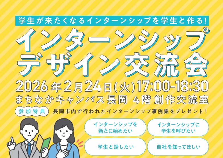 地域の人事部長岡では、「学生が来てくれるインターンシップを学生と作る!インターンシップデザイン交流会」を開催します。