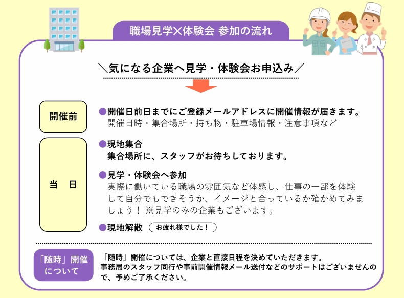 ※企業によっては、開催日程が「随時」の場合がございます。企業へ直接お問い合わせください。                                                                       ※「随時」の場合はスタッフの同行はありませんので、予めご了承ください。                                                                             ※参加人数が少ない場合は、開催を中止させていただく場合がございます。