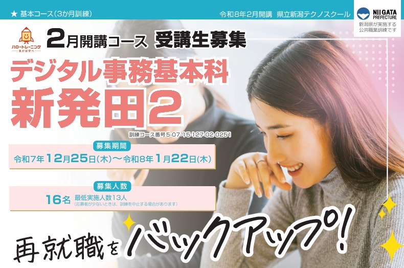 【新発田市 2026年2月~5月】公共職業訓練「デジタル事務基本科新発田2」受講生募集のご案内