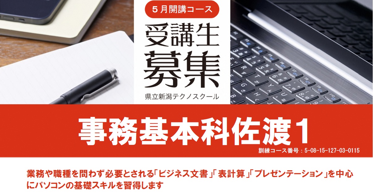 【佐渡市 2026年5月~8月】公共職業訓練「事務基本科佐渡1」受講生募集のご案内